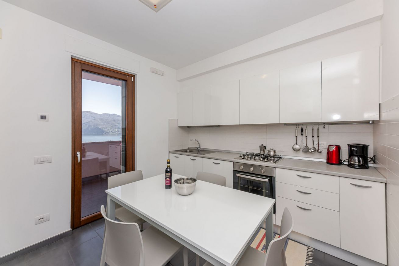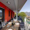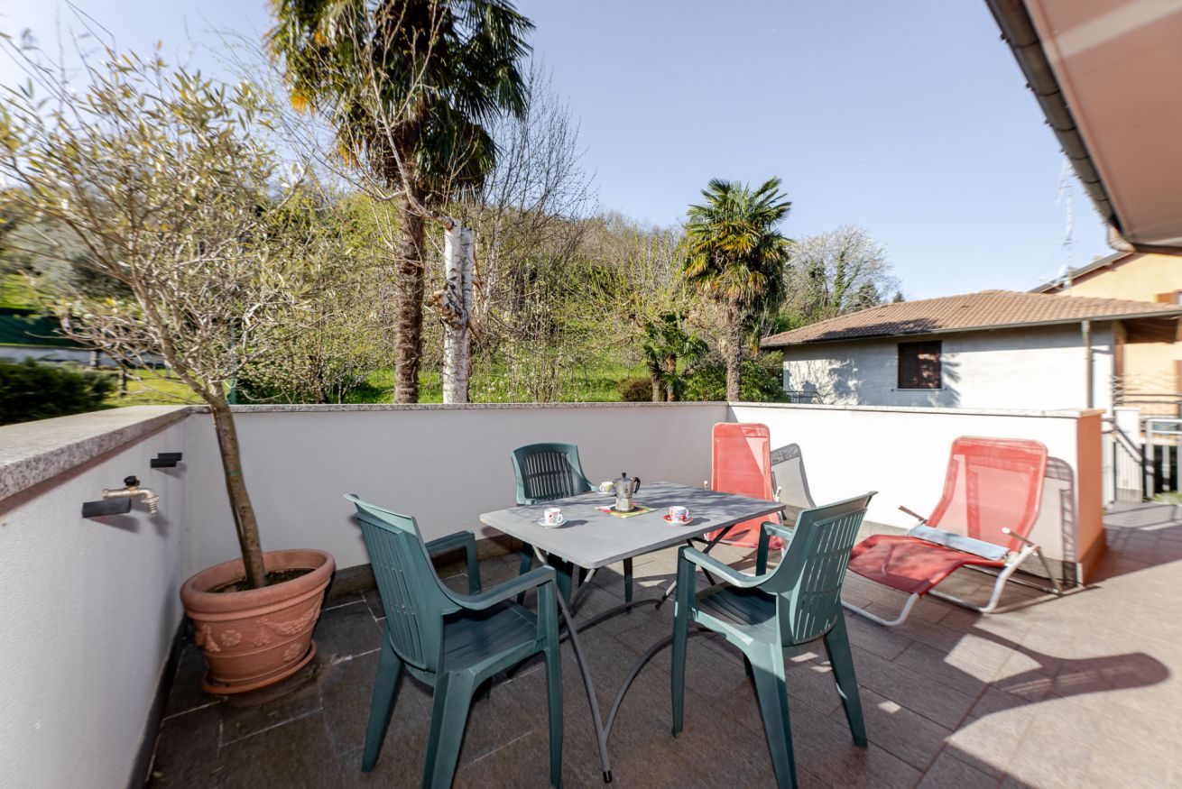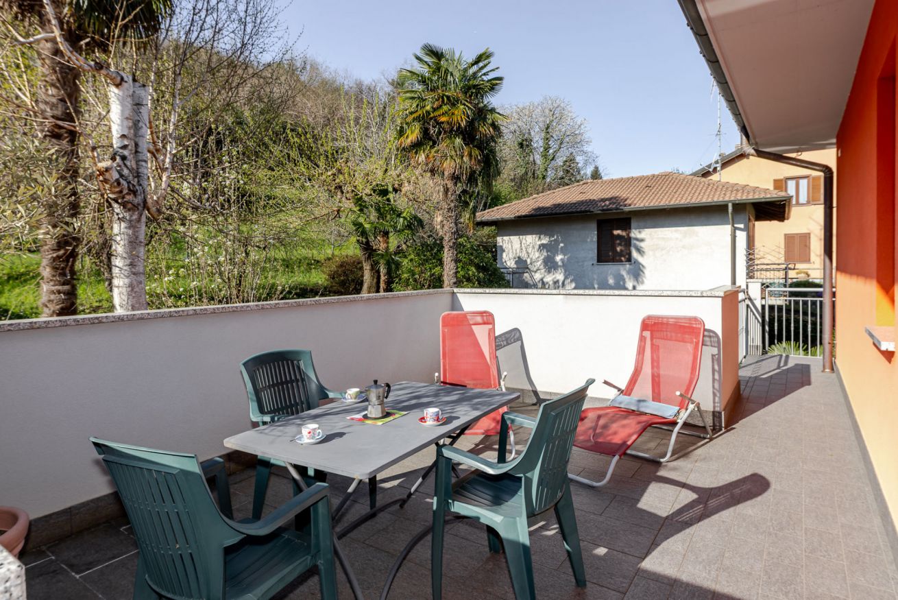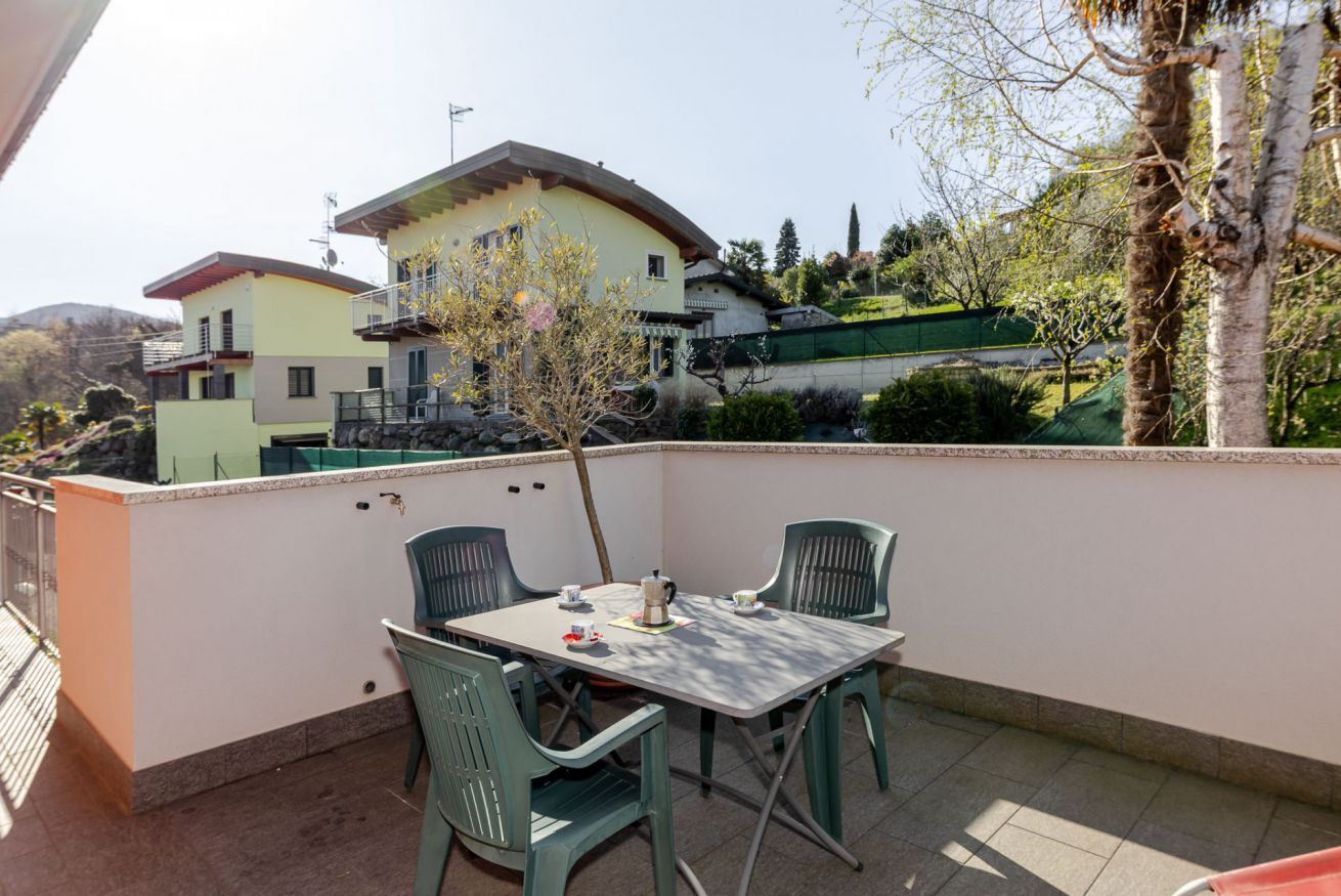La terrazza principale, di circa 50 mq, è il luogo ideale per rilassarsi e godere di pasti all'aperto, offrendo un panorama spettacolare sul Lago Maggiore e le montagne.
