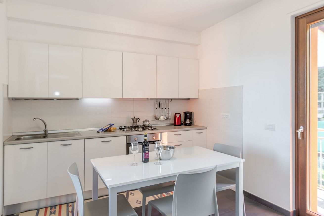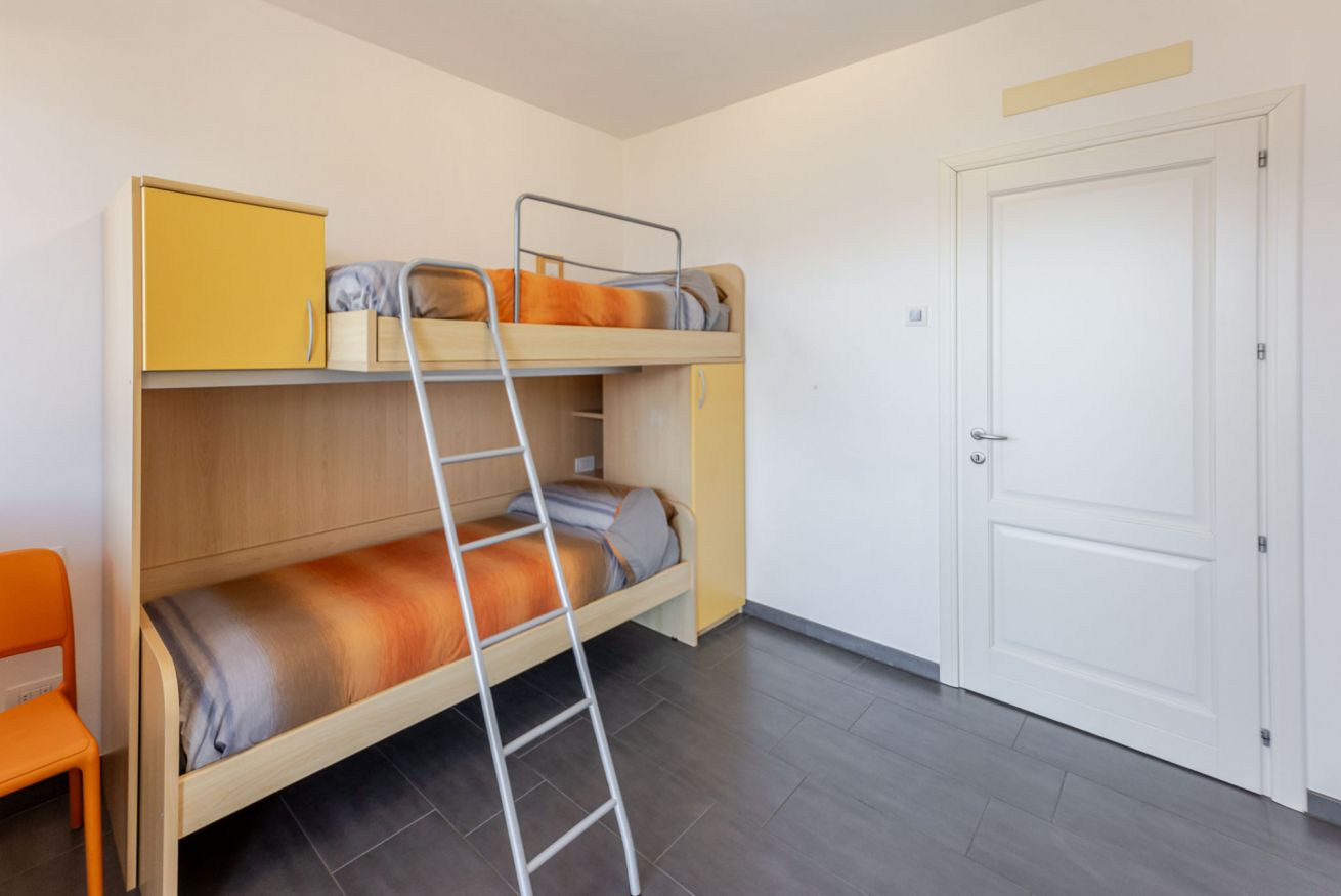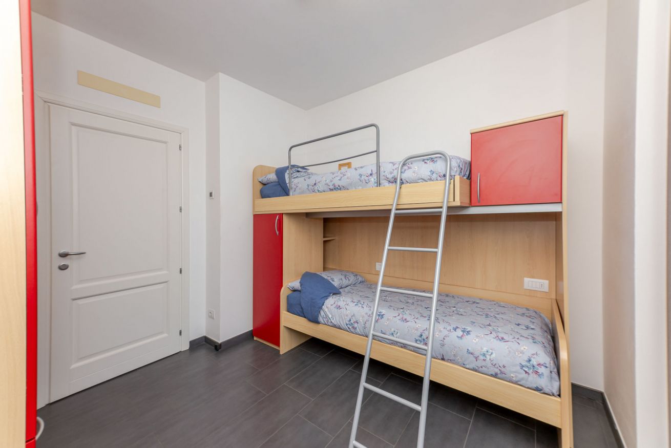 L'appartamento, dotato di zanzariere su tutte le finestre e porte finestre, si compone di una spaziosa camera matrimoniale, due camere con letti a castello, un ampio soggiorno, una cucina completamente attrezzata, e due bagni con doccia.