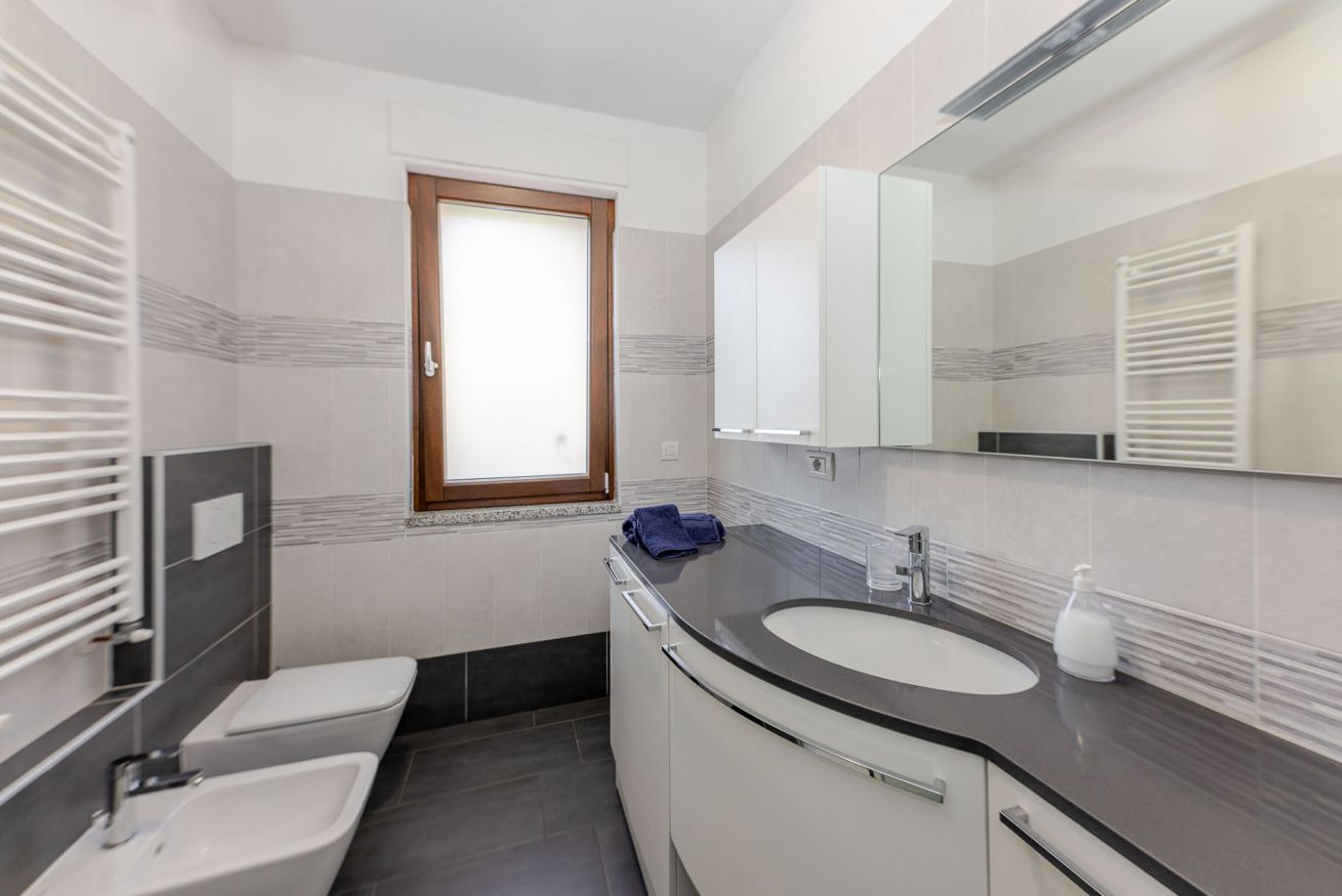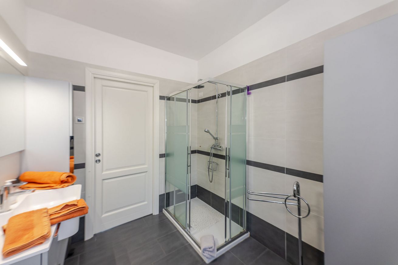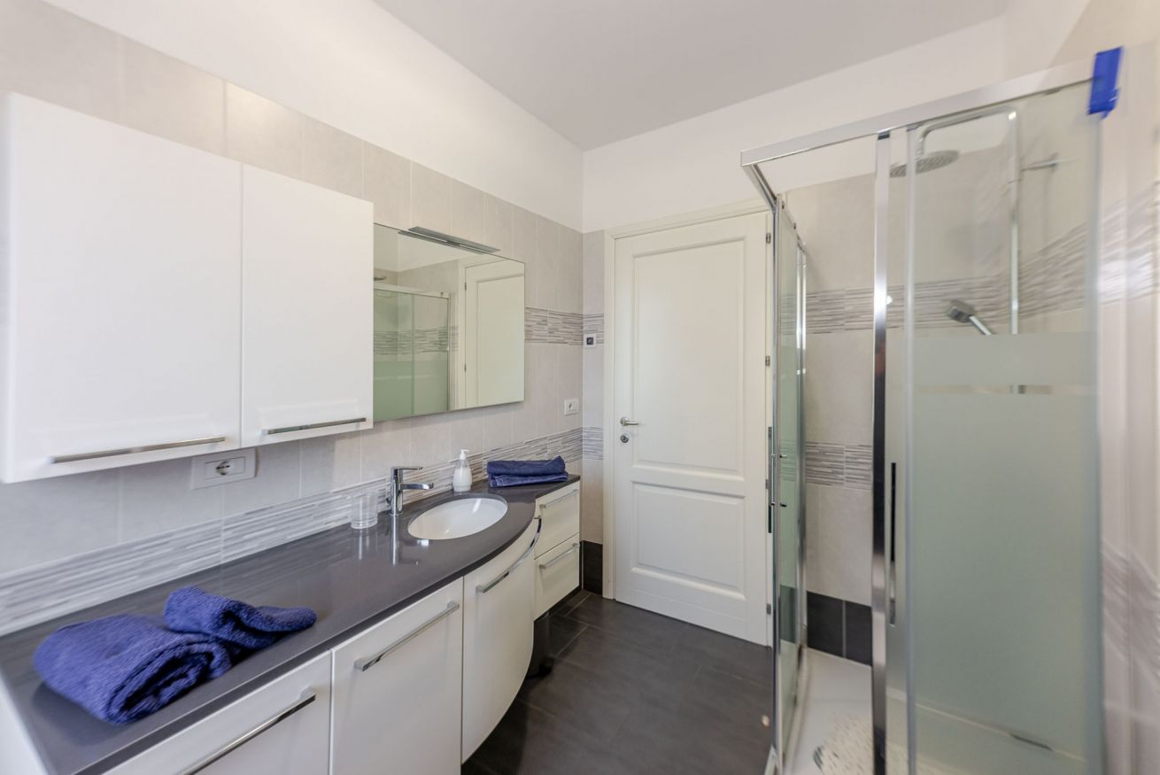 L'appartamento, dotato di zanzariere su tutte le finestre e porte finestre, si compone di una spaziosa camera matrimoniale, due camere con letti a castello, un ampio soggiorno, una cucina completamente attrezzata, e due bagni con doccia.