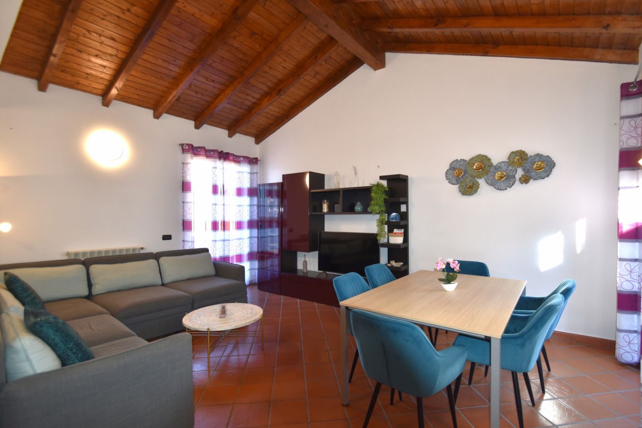 La villa, disposta su due livelli, offre un ingresso indipendente e si compone di una camera matrimoniale, una cameretta, un accogliente soggiorno, una cucina attrezzata, due bagni, un portico e un giardino.